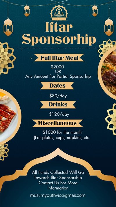To donate, an etransfer can be sent to muslimyouthvic@gmail.com or you can use the donation form below. Please include the note "For Iftar sponsorship" in the message box. Donations towards iftars can also be given directly to Sheikh Younus, Ayman Hammado, or Abdullah Kathrada.
